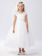 This stunning Illusion Neckline Bodice with Lace Applique and Rhinestones, combines elegance and tradition for your child's special day. Featuring delicate embroidery and sparkling sequins on the waistline, the tea-length design offers a timeless look, perfect for celebrating the sacrament of First Communion. The luxurious satin fabric adds a touch of grace, ensuring she feels beautiful and blessed on this momentous occasion.